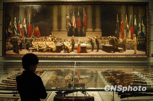 描绘抗战胜利、日军投降的大幅油画,下方陈列大量缴获的日军武器。中新社发 侯宇 摄
