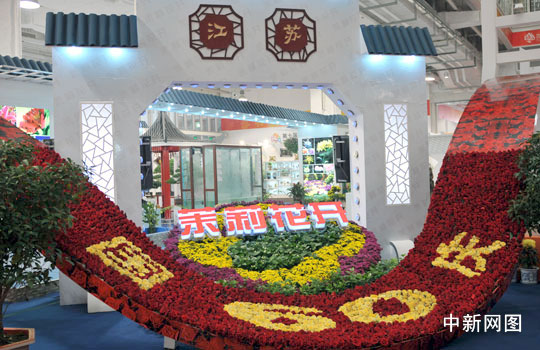 图为江苏展台推出的喜迎国庆大型鲜花横幅。中新网记者 金硕 摄