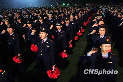 9月25日,即将参加国庆六十周年庆祝活动的“依法治国”方阵在北京举行誓师仪式,该方阵由来自中直机关、中央国家机关、北京市直机关和中国政法大学4支大队共120家部门和单位的2323名队员组成。