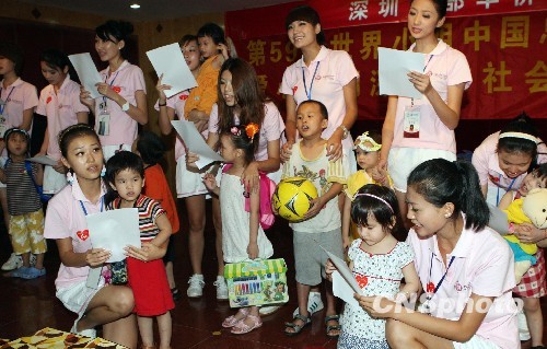 9月25日,国庆60周年之际,正在深圳东部华侨城参加第59届世界小姐中国区总决赛的60位佳丽来到深圳福利院慰问孤儿。