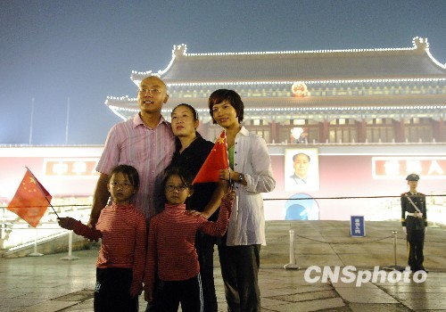 9月25日,一对双胞胎女孩手持国旗与其家人在天安门前合影留念。中新社发 侯宇 摄