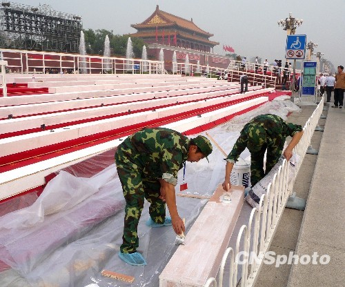 图为工作人员正在为天安门观礼台加装长“凳子”。中新社发 玉龙 摄