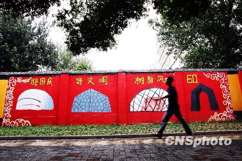 “国庆文化墙”涂鸦现身北京。中新社发 郑雄增 摄