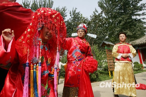 9月26日,“2009年山东潍坊中式古典集体婚礼”拉开帷幕,5对新人将让全体潍坊市民见证他们美好的爱情和盛大的婚礼。据了解,此次古典集体婚礼,有新娘坐花轿、新郎骑大马、悬挂同心锁、金婚夫妇向新人证婚、栽植爱情纪念树、放生红鲤鱼、共享潍坊第一婚宴等精彩纷呈的婚庆活动。近年来,山东潍坊市不少新人开始放弃现代的婚礼方式,热衷于举办中国古典式婚礼,从中体会中国传统文化的韵味。