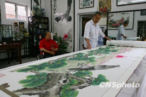 9月26日,北京石景山区的70岁老翁李福展示他近日完成的120米画卷《祖国颂》。这幅长卷由65张6尺的宣纸连接而成,重达25公斤。李福是齐白石流派的第三代传人,今年是他的金婚之年,也正值新中国60年国庆,他用绘制长卷的方式来表达对祖国的祝愿,也表达了对妻子的祝福。