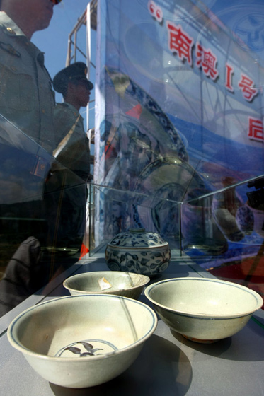 2009年9月26日,汕头市南澳县“南澳I号”水下考古抢救发掘启动仪式现场,一批先期出水的古代瓷陶器吸引了考古专家和媒体的关注。陈伟斌 摄