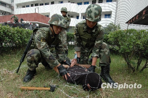 温州边防特警队员将一名被网枪击中的“恐怖分子”成功抓获。中新社发 吴水斌 摄