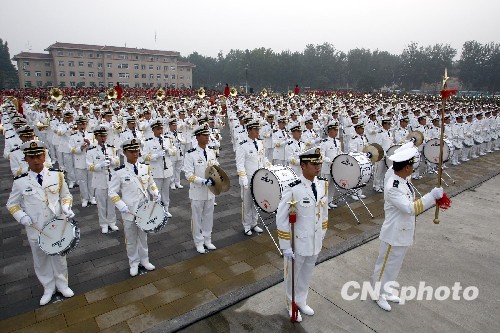 参加国庆60周年庆典的军乐团、民乐团、合唱团举行最后一次大型合练。中新社发 郑雄增 摄