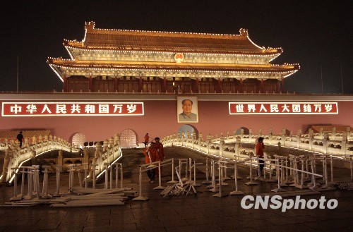 9月27日晚,工人正在加班拆除北京天安门金水桥护栏,以迎接建国60周年大阅兵的到来。