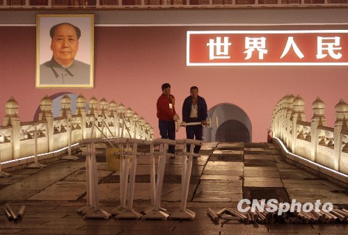 北京天安门金水桥护栏拆除。中新社发 吴芒子 摄