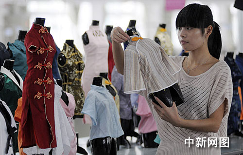 图为大学生在整理陈列服装。