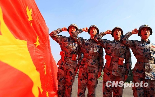 近日,在国庆阅兵即将到来的时刻,空降兵战车方队一台战车上的来自4个不同民族的战士,在国旗前庄严宣誓。图片从左至右分别是:车长吕英鹤,吉林满族人;驾驶员朱石峰,湖南汉族人;炮手周光银,湖北土家族人;载员杨平川,贵州苗族人。中新社发 卢炳广 摄