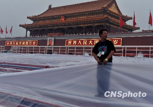 图:天安门国庆观礼台做好防雨准备(2)