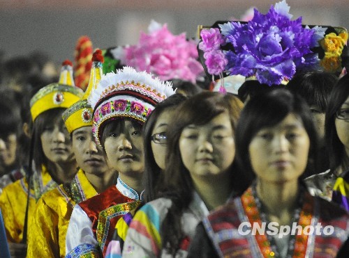 中央民族大学的学生在国庆庆典誓师大会上翘首以待。中新社发 侯宇 摄