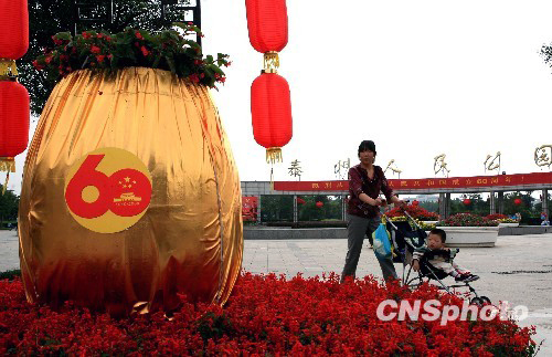 江苏泰州市区街道张灯结彩,国旗飘飘,迎接新中国六十华诞的到来。中新社发 顾祥忠 摄