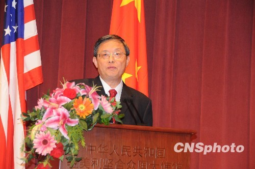中国驻美大使馆二十九日晚举行庆祝中华人民共和国成立六十周年招待会,多名美国政要及美国各界友好人士近一千人到场道贺。图为中国驻美大使周文重在招待会上致辞。中新社发 吴庆才 摄