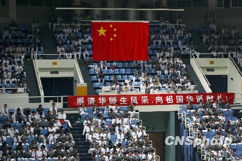 10月1日凌晨,北京清华大学举行国庆六十周年庆典活动出征誓师大会。中新社发 郑雄增 摄