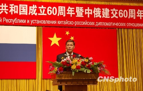 图为俄政府副总理茹科夫在招待会上致辞。中新社发 田冰 摄