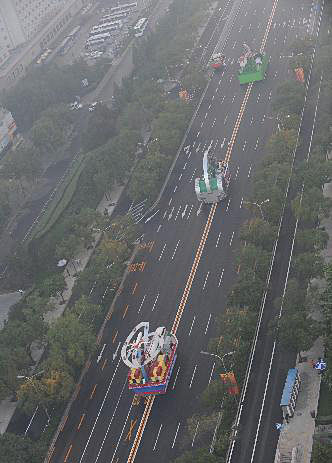 参加游行的彩车通过建国门外大街向长安街指定地点集结。徐亮 摄