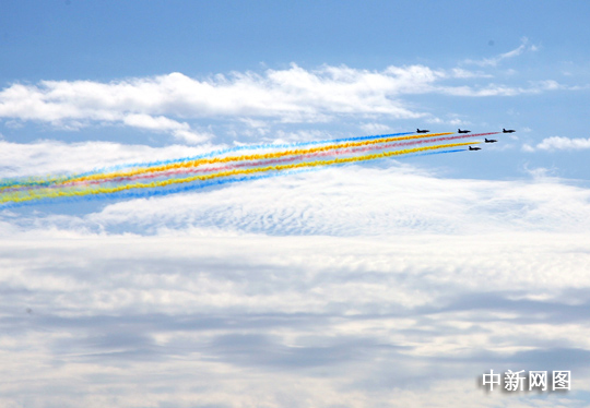 10月1日,首都各界庆祝中华人民共和国成立60周年大会在北京举行。图为教练机编队经过。中新网记者 金硕 摄