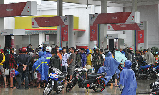 在印度尼西亚的西苏门答腊,人们在等待加油。