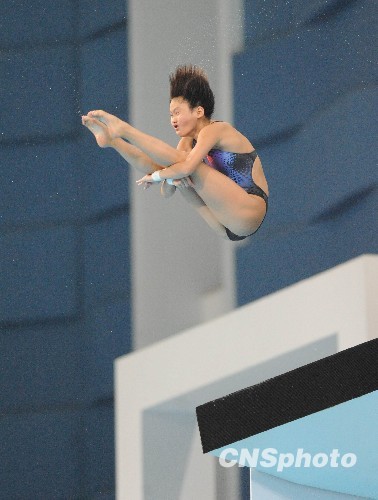 10月6日,江苏队选手陈若琳在比赛中。当日,在第十一届全国运动会女子10米跳台跳水决赛中,陈若琳以439.35分的成绩获得冠军。天津队的汪皓、湖北队朱佳明分获二、三名。