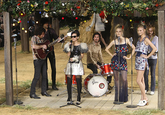 10月6日,模特在法国巴黎展示德国设计师卡尔·拉格费尔德为香奈儿(Chanel)设计的春夏新品。在本次2010巴黎春夏时装周上,香奈儿将清新的田园风格融入了新一季的作品中。
