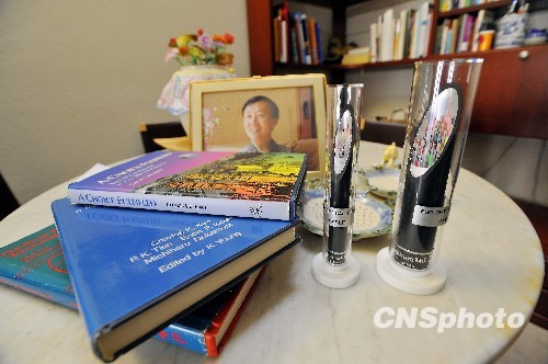 “光纤之父”高锟和夫人在美国硅谷的寓所内,陈列着光纤样品和其英文著作。中新社发 陈钢 摄