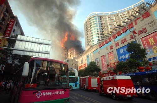 10月8日,湖南株洲,受30层着火高楼殃及的附近楼群的市民在焦急等待着现场勘察的结果。10月7日下午16时25分左右,湖南省株洲市芦淞区建设南路高30余层、已经封顶并正在装修的“环球国际”大楼楼顶突然起火,秧及周边的江海房产大厦,附近几百米内的楼房楼顶多处因飞溅的火花产生小火。