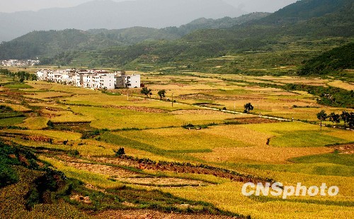 江西婺源金秋稻黄丰收如画。中新社发 王国红 摄