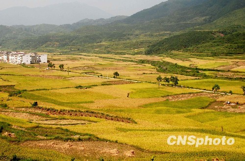 江西婺源金秋稻黄丰收如画。中新社发 王国红 摄
