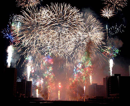 图:朝鲜举行烟火表演纪念建党64周年(2)