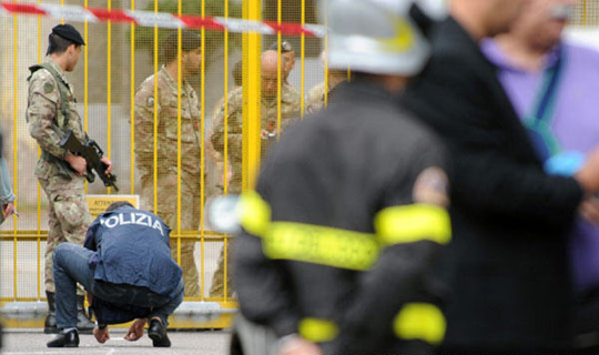10月12日,在意大利米兰一处军事营地,发生了一起炸弹爆炸事件,造成2人受伤,其中包括袭击者。图为警察在炸弹爆炸事件发生地调查取证。