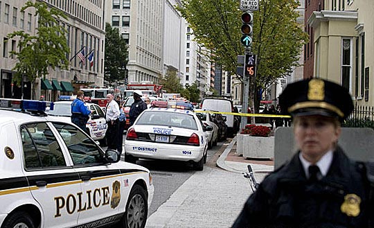 10月12日,在美国首都华盛顿,警察封锁了白宫附近的街道。当日,警察在白宫前的走道上发现一可疑背包。安全人员随后将可疑背包移走并封锁了白宫附近的道路。