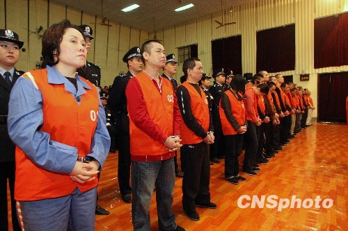 10月14日,文强弟媳谢才萍“涉黑”团伙共22人,站上重庆市第五中级人民法院被告席受审。被指控为团伙头目的谢才萍(左一),一审被指控犯组织、领导黑社会性质组织罪、开设赌场罪、非法拘禁罪、容留他人吸毒罪、行贿罪五宗罪。中新社发 汪放 摄