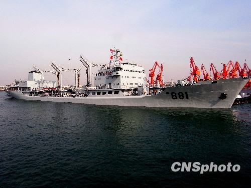 洪泽湖号远洋综合补给舰正在驶离码头。 中新社发 鄢润波 摄