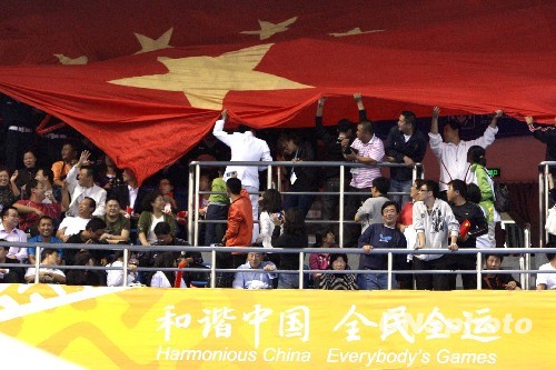 10月18日晚,第十一届全运会羽毛球比赛青岛赛区举行,热情的观众在看台传递巨幅国旗,为选手加油。中新社发 张宇 摄