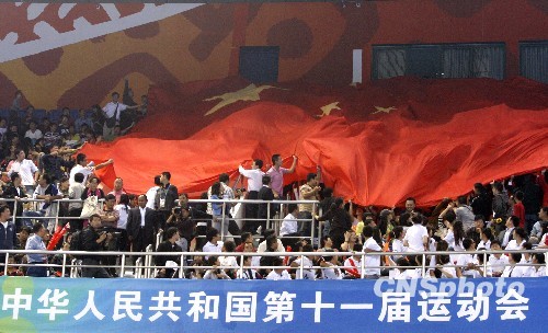 10月18日晚,第十一届全运会羽毛球比赛青岛赛区举行,热情的观众在看台传递巨幅国旗,为选手加油。中新社发 张宇 摄