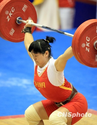 10月19日,在全运会女子举重69KG级的比赛中,代表山东出战的名将刘春红以总成绩267KG获得冠军。中新社发 汤彦俊 摄