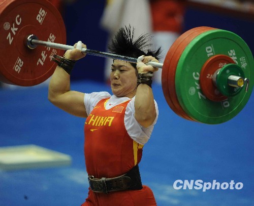 2009年10月19日,山东姑娘刘春红以总成绩267公斤夺得全运会女子举重69公斤级冠军,实现全运会三连冠。中新社发 吴峻 摄