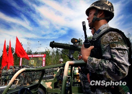 解放军济南军区“前锋-2009A”军事演习,将于10月21日在某合同战术训练基地举行,参加演习部队10月20日组织战前动员。这次演习主要是由兵力兵器数量规模向信息火力效能聚优转变、指挥的重心由主攻方向上的重点突破向作战关节要害的体系毁瘫转变、火力的运用由概略粗放决策向科学精细筹划转变、协同的重点由地面步坦行动向陆空火力协调转变、行动的控制由时间位置推进量向效果态势达成度转变、作战的目的由歼敌夺地向控要制权转变。 中新社发 宋吉河 摄