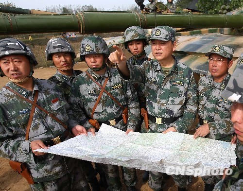 演习总导演、某集团军参谋长胡修斌少将,向参演部队布置战斗任务,演习主要进行陆空火力协同山地进攻战斗演练。中新社发 宋吉河 摄