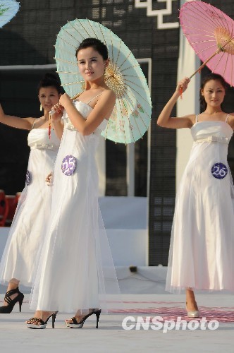 10月20日,2010杭州中国丝绸城杯国际旅游小姐中国华东赛区总决赛丝绸丽人赛在杭州西湖文化广场举行,50位佳丽参赛。中新社发 引炜 摄