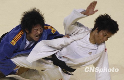 10月20日,第十一届全运会女子52公斤级柔道比赛在山东滨州举行,来自广东的冼东妹(白)险胜湖南何红梅,获得冠军。图为运动员在比赛中。中新社发 张宇 摄