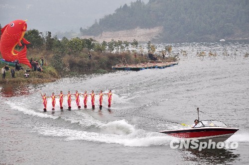 国家特级滑水队队员表演的多人叠罗汉、双人飞板、6人绕船360、滑板水上芭蕾等赢得人们喝彩。中新社发 张枥 摄