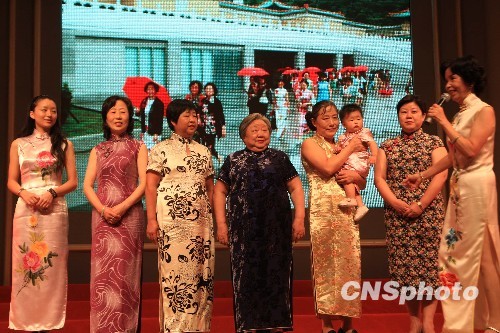 10月22日,上海一家庭七位女性,四代同堂登台演绎旗袍魅力,其中包括一岁女孩和七十七岁阿婆,成为当日《旗袍,向世博走来》大型汇报演示中最引人注目的一幕。旗袍一直是上海女人钟爱的礼服,如今,穿旗袍、展旗袍、秀旗袍,已经成为上海旗袍沙龙推广旗袍、提升女性品位的常规活动。中新社发 潘索菲 摄