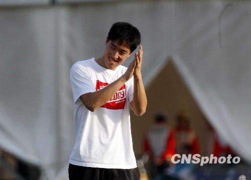 10月22日下午,“飞人”刘翔亮相济南奥体中心田径训练场,在教练孙海平的带领下,为即将开始的全运110米栏的比赛做准备。中新社发 汤彦俊 摄