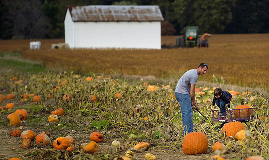 图为10月22日美国伊斯顿一名男子带着孩子在南瓜田里摘南瓜。