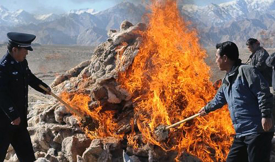 10月22日,可可西里国家级自然保护区管理局在青海省格尔木市郊公开销毁了2282张缴获的藏羚羊皮。可可西里管理局局长才旦周介绍说,公开销毁的藏羚羊皮都是自1999年以来保护队员在反盗猎行动中缴获的。自1998年向武装盗猎分子打响了第一枪,可可西里管理局共组织反盗猎巡山300余次,总行程达70万公里,破获各类案件上百起,缴获非法枪支68支,收缴藏羚羊皮4000余张。