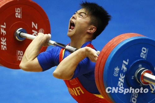 10月23日,第11届全运会男子举重56公斤级比赛结束了冠军之争。北京奥运会冠军龙清泉以抓举133公斤(超亚洲纪录)、挺举169公斤(超世界纪录),总成绩302公斤(破全国纪录)问鼎金牌。 中新社发 富田 摄